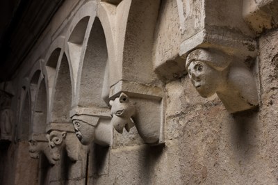 The external wall of the Ghirlandina is richly sculpted in recovered stone. Much of this is from Modena of the Roman era, as confirmed by findings from the scientific research carried out during the restoration project of 2006-7. Each stringcourse cornice is decorated with overlying arches, either simple or intertwined, and figured protomes, many of which were substituted by geometric consoles during subsequent restoration. At the edges of the first three cornices there are also prestigious cornerstones sculpted with imaginary figures from medieval bestiary (cornice 1) animal and human figures (cornice 2 and 3).